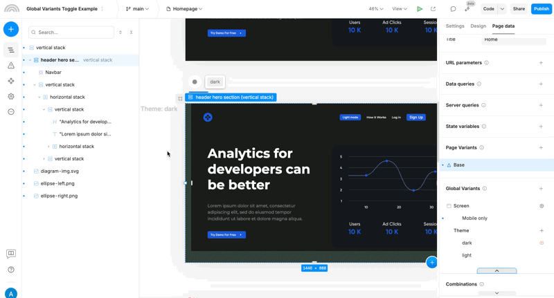 Global variants are similar to normal (component-specific) variants, in that components can appear differently in different global variants. However, global variants apply across the entire project, meaning that any component can have specific style settings defined under a single “Dark mode” variant.