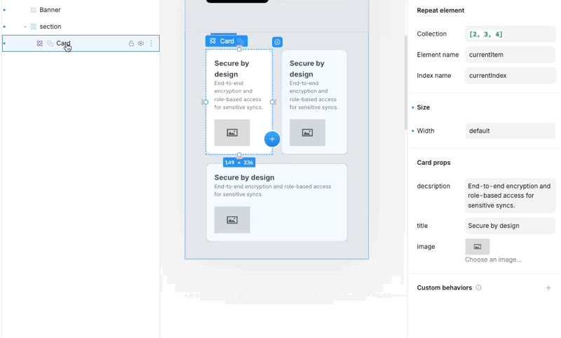 Click on the Card component instance, then in the right sidebar click the + button in the Repeat element section.